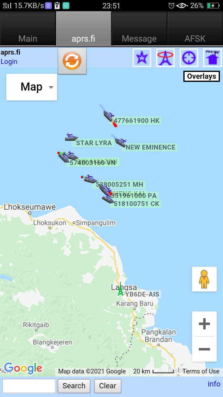 Pada malam ini, kelihatan stesen YB6DE-AIS telah diaktifkan di Langsa. Beberapa ikon bot dan kapal telah kelihatan di perairan Selat Melaka utara Sumatera. AIS adalah singkatan Automatic Identification System. Sistem pengesanan untuk pengangkutan laut.
